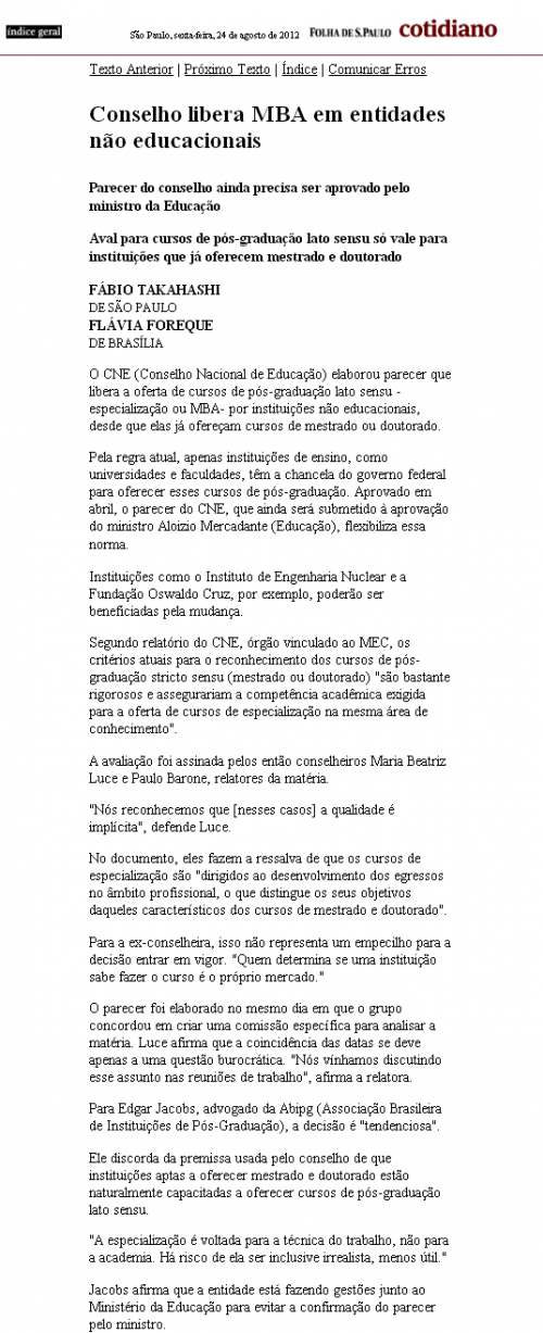 Pela regra atual, apenas instituições de ensino, como universidades e faculdades, têm a chancela do governo federal para oferecer esses cursos de pós-graduação. Aprovado em abril, o parecer do CNE, que ainda será submetido à aprovação do ministro Aloizio Marcante (Educação), flexibiliza essa norma.