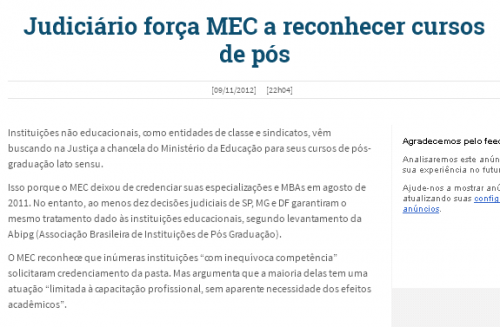 Isso porque o MEC deixou de credenciar suas especializações e MBAs em agosto de 2011. No entanto, ao menos dez decisões judiciais de SP, MG e DF garantiram o mesmo tratamento dado às instituições educacionais, segundo levantamento da Abipg (Associação Brasileira de Instituições de Pós Graduação).