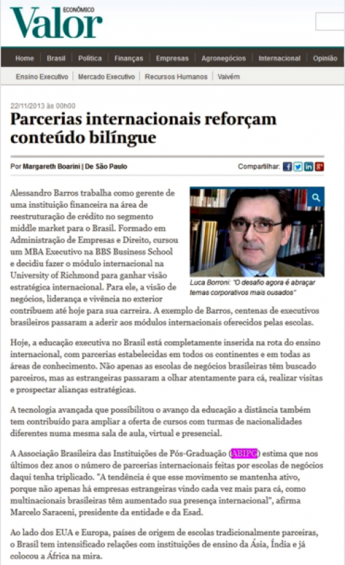 A Associação Brasileira das Instituições de Pós-Graduação (ABIPG) estima que nos últimos dez anos o número de parcerias internacionais feitas por escolas de negócios daqui tinha triplicado. "A tendência é que esse movimento se mantenha ativo, porque não apenas há empresas estrangeiras vindo de cada vez mais para cá, como multinacionais brasileiras têm aumentado sua presença internacional", afirma Marcelo Saraceni, presidente da entidade e da Esad.
