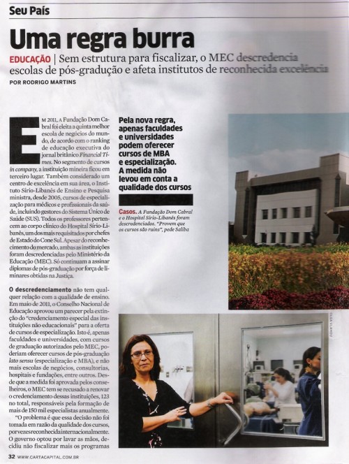 O descredenciamento não tem qualquer relação com a qualidade de ensino. Em maio de 2011, o Conselho Nacional de Educação aprovou um parecer pela extinção do "credenciamento especial das instituições não educacionais" para a oferta de cursos de especialização. Isto é, apenas faculdades e universidades, com cursos de graduação autorizadas pelo MEC, poderiam oferecer cursos de pós-graduação lato sensu (especialização e MBA), e não mais escolas de negócios, consutorias, hospitais e fundações, entre outros. Desde que a medida foi aprovada pelos conselheiros, o MEC tem se recusado a renovar o credenciamento dessas instituições, 123 no total, responsáveis pela formação de mais de 150 mil especialistas atualmente.