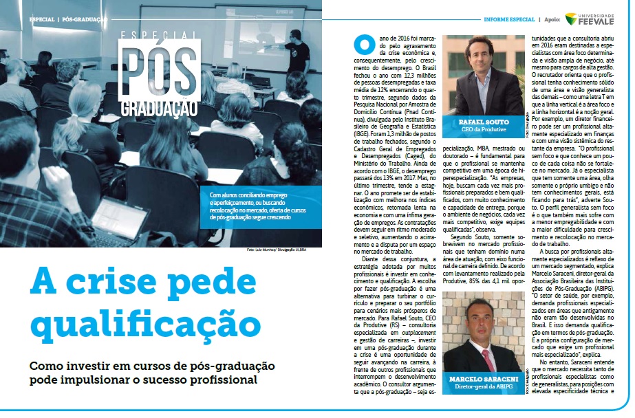 alternativa para turbinar o currículo e preparar o seu portfólio para cenários mais prósperos de mercado. Para Rafael Souto, CEO da Produtive (RS) – consultoria especializada em outplacement e gestão de carreiras –, investir em uma pós-graduação durante a crise é uma oportunidade de seguir avançando na carreira, à frente de outros profissionais que interrompem o desenvolvimento acadêmico. O consultor argumenta que a pós-graduação – seja especialização, MBA, mestrado ou doutorado – é fundamental para que o profissional se mantenha competitivo em uma época de hiperespecialização. “As empresas, hoje, buscam cada vez mais profissionais preparados e bem qualificados, com muito conhecimento e capacidade de entrega, porque o ambiente de negócios, cada vez mais competitivo, exige equipes qualificadas”, observa.
