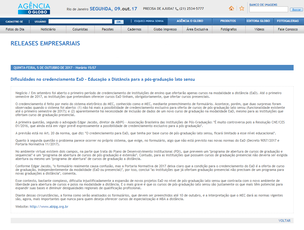 Fonte Agência O Globo: http://www.agenciaoglobo.com.br/dinonews/Default.aspx?idnot=34439&tit=Dificuldades+no+credenciamento+EaD+-+Educa%C3%A7%C3%A3o+a+Dist%C3%A2ncia+para+a+p%C3%B3s-gradua%C3%A7%C3%A3o+lato+sensu