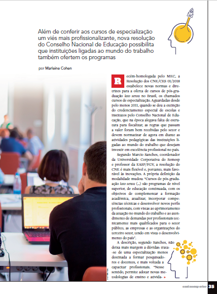 Segundo Marcio Sanches, coordenador da Universidade Corporativa do Semesp e professor da EASP/FGV, a resolução do CNE é mais flexível e, portanto, mais favorável às inovações. A própria definição da modalidade mudou: “Cursos de pós-graduação lato sensu (...) são programas de nível superior, de educação continuada, com os objetivos de complementar a formação acadêmica, atualizar, incorporar competências técnicas e desenvolver novos perfis profissionais, com vistas ao aprimoramento da atuação no mundo do trabalho e ao atendimento de demandas por profissionais tecnicamente mais qualificados para o setor público, as empresas e as organizações do terceiro setor, tendo em vista o desenvolvimento do país”.