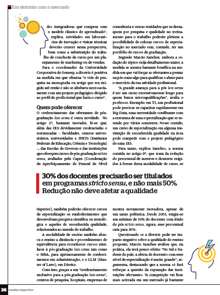 Para tanto, explica Sanches, a norma contida no artigo 9º, que trata da redução do percentual de mestres e doutores exigidos à frente desta modalidade de curso, se mostra novamente inovadora, apesar de um tanto polêmica. Desde 2001, exigia-se um mínimo de 50% de docentes com título de pós stricto sensu. Agora, esse percentual caiu para 30%.