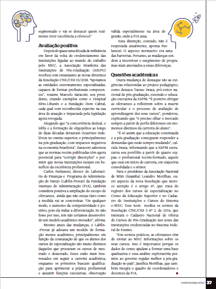 Outra mudança de destaque são as exigências relacionadas ao projeto pedagógico, como destaca Tatsuo Iwata, pró-reitor nacional de pós-graduação, extensão e educação executiva da ESPM. “É positivo obrigar as ofertantes a refletirem sobre a matriz curricular e o processo de avaliação de aprendizagem dos seus cursos”, ponderou, explicando que “é preciso olhar o mercado sempre a partir de perfis diferentes em momentos distintos da carreira do aluno”.