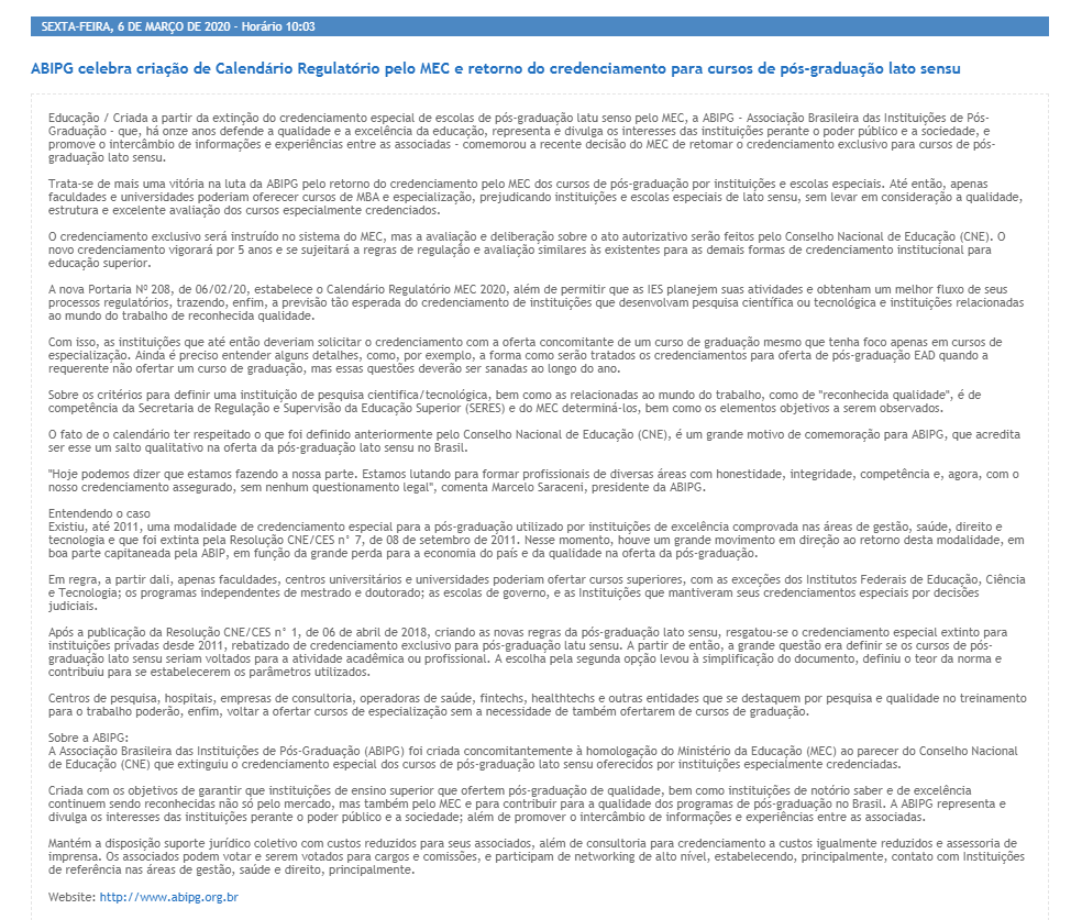 O fato de o calendário ter respeitado o que foi definido anteriormente pelo Conselho Nacional de Educação (CNE), é um grande motivo de comemoração para ABIPG, que acredita ser esse um salto qualitativo na oferta da pós-graduação lato sensu no Brasil.